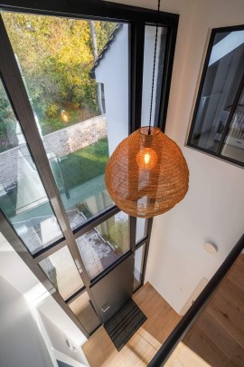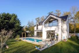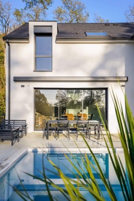 Les lignes épurées et les ouvertures verticales apportent rythme et légèreté à l’ensemble, tout en favorisant une luminosité naturelle généreuse. À l’arrière, la maison s’ouvre largement sur un jardin paysager et une terrasse conviviale, créant une continuité fluide entre intérieur et extérieur. La piscine, intégrée avec discrétion, devient un élément central de détente et de bien-être.
