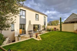 À l’extérieur, la maison s’inscrit harmonieusement dans son environnement tout en préservant intimité et sérénité. Le jardin, structuré en plusieurs niveaux, offre des espaces distincts dédiés à la détente et aux moments de partage. La terrasse, accessible depuis les pièces de vie, prolonge naturellement l’intérieur vers l’extérieur.