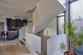Dès l’entrée, l’escalier sculptural devient une véritable pièce maîtresse, apportant caractère et fluidité à la circulation intérieure. Les espaces de vie, ouverts et lumineux, s’organisent autour d’une cuisine moderne parfaitement intégrée, favorisant convivialité et confort au quotidien. Les matériaux, soigneusement sélectionnés, traduisent une exigence de qualité et un souci du détail omniprésent.